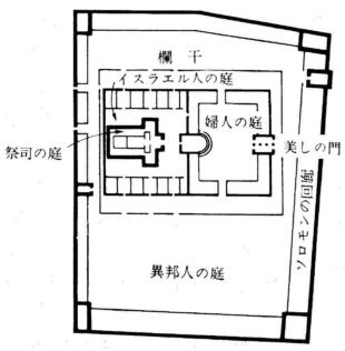 主イエスの時代のエルサレム神殿は中央に聖所が建ち、それを取り囲むように庭が区切られていました(図参照)。異邦人は “異邦人の庭” まで、イスラエル人の婦人は “婦人の庭” まで、イスラエル人の男性は“イスラエル人の庭”まで、と立ち入りが制限されていました。“祭司の庭”と聖所には祭司しか、さらに奥の至聖所には大祭司が年に一度しか入ることができませんでした。